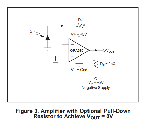 OPA380的输出可以在一个电源上摆动到地面,或略低于地面。这种扩展的输出摆动需要使用另一个电阻和一个额外的负电源。可以在输出端和负极电源之间连接一个下拉电阻器,将输出端拉低到0V。见图3。