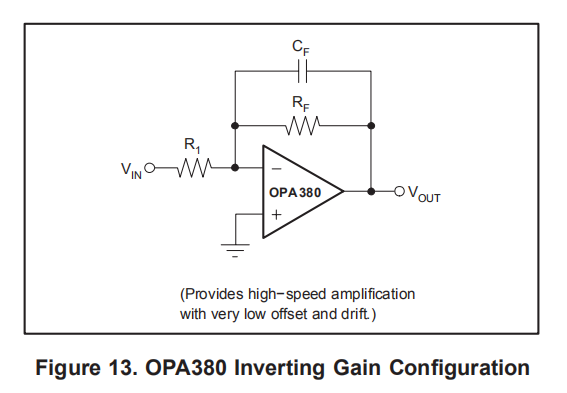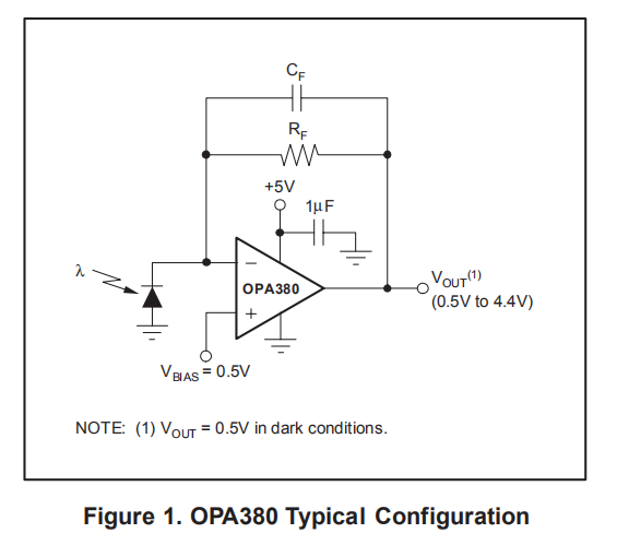 OPA380用于反转配置,非反转输入用作固定偏置点。图1显示了典型配置中的OPA380。电源插脚应使用1μF陶瓷或钽电容器绕过。不建议使用电解电容器。