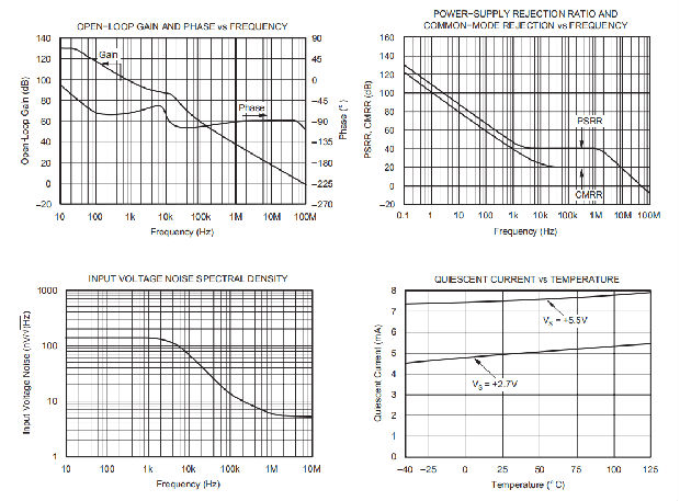 OPA380系列运算放大器在−40°C至+125°C的温度范围内完全规定为2.7V至5.5V。随工作电压或温度而显著变化的参数显示在典型特性中。