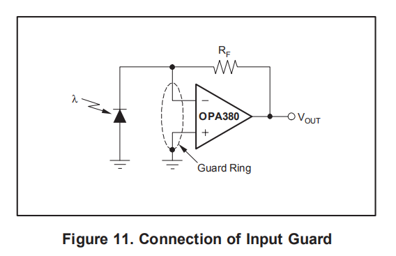 电路板泄漏会降低其他设计良好的放大器的性能。仔细清洁电路板。环绕求和结并以相同电压驱动的电路板保护轨迹可以帮助控制漏电,如图11所示。