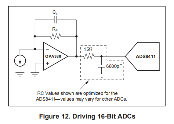 OPA380系列是为驱动快速16位而优化的ADC如ADS8411。OPA380运算放大器缓冲转换器的输入电容和由此产生的电荷注入,同时提供信号增益。图12显示了OPA380在一个单端方法接口的ADS8411 16位,2MSPS ADC。有关更多信息,请参阅ADS8411数据表。