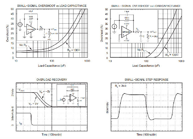 OPA380系列运算放大器可驱动高达500pF的纯电容负载。增加增益可以增强放大器驱动更大电容性负载的能力(参见典型特性曲线,小信号过冲与电容性负载)。