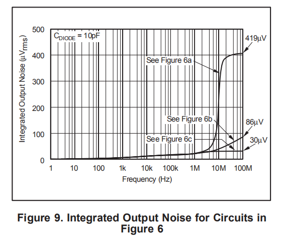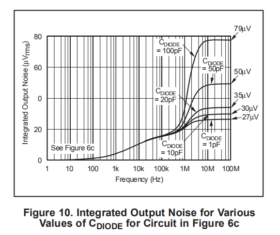 图10显示了二极管电容对集成输出噪声的影响,使用图6c中的电路。