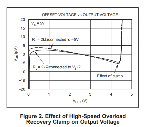 OPA380的摆幅比规定的正轨稍近;但是,线性度会降低,高速过载恢复钳位限制了可用的正输出电压摆幅量,如图2所示。