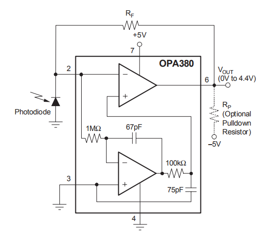 由于OPA380的高精度和低噪声特性,可实现4到50年的动态范围。例如,该能力允许在单个I/V转换级中测量1nA量级的信号电流,最高可达100μA。与对数放大器相比,OPA380在整个动态范围内提供非常宽的带宽。通过使用一个外部下拉电阻到-5V,输出电压范围可以扩展到包括0V。