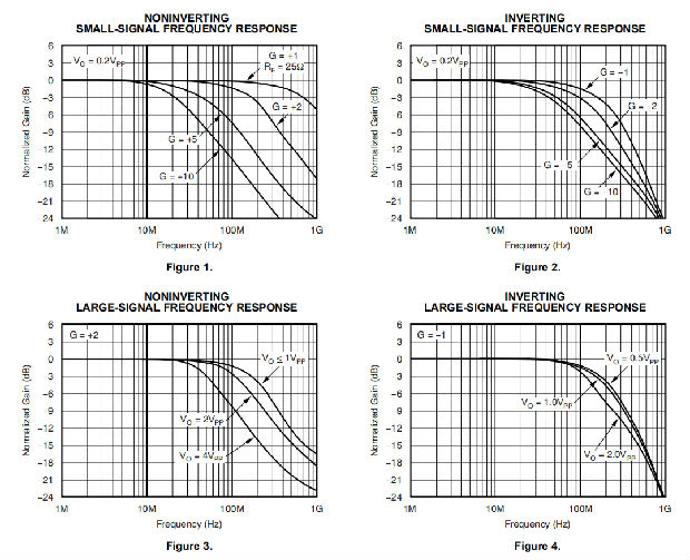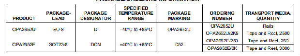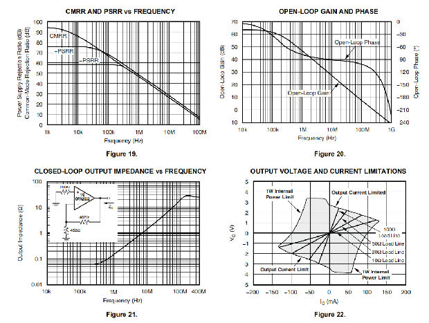 OPA2652内部补偿了单位增益稳定性。它有特殊的带宽(700MHz)作为单位增益缓冲器,几乎没有峰值(0dB典型值)。在1.5mV的输入偏置电压和300nA的输入偏置电流下,实现了优异的直流精度。