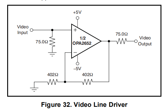 图32显示了用作视频线驱动程序的OPA2652。其出色的差分增益和相位允许它用于录音室设备,而其低成本和SOT23-8封装选项也支持消费者应用。