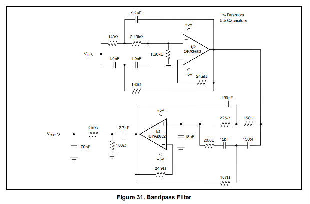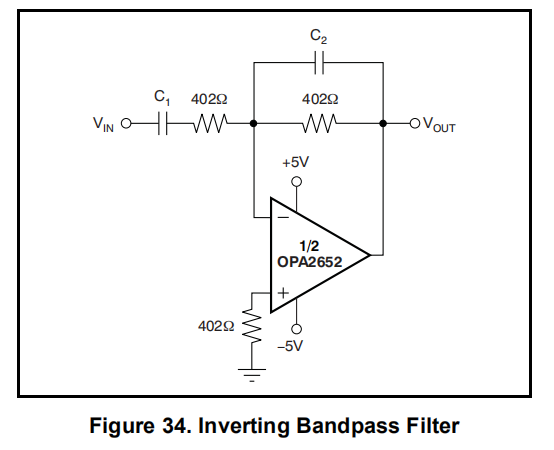 简单的带通滤波器如图34所示。OPA2652非常适合这种类型的电路,因为它在+1的噪声增益下非常稳定。