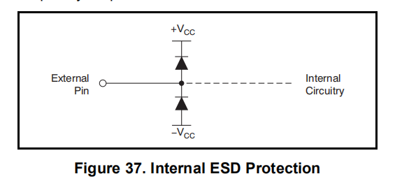 OPA2652是使用非常高速的互补双极工艺制造的。对于这些非常小的几何器件,内部结击穿电压相对较低。这些细分反映在绝对最大评级表中。如图37所示,所有设备引脚都由内部ESD保护二极管保护电源。
