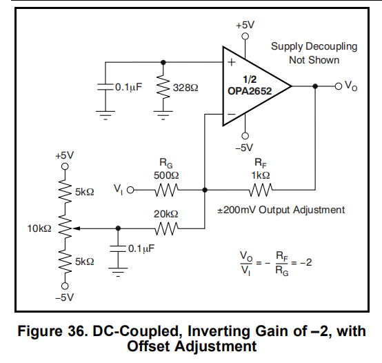 通常需要微调输出偏移零点或直流工作点调整。在运算放大器电路中引入直流偏移控制有很多种技术。这些技术大多是通过反馈电阻增加直流电流。在选择偏移微调方法时,一个关键考虑因素是对期望信号路径频率响应的影响。如果信号路径是非可逆的,则最好将偏移控制作为逆变和信号应用,以避免与信号源的交互。如果信号路径要反转,可以考虑对非反转输入应用偏移控制。然而,求和结上的直流偏移电压会使直流电流返回到电源中,这一点必须加以考虑。对反向运算放大器输入应用偏移调整可以改变噪声增益和频率响应平坦度。对于直流耦合逆变放大器,图36显示了对信号频率响应影响最小的偏移调整技术的一个示例。在这种情况下,直流偏移电流通过比信号通路电阻大得多的电阻值进入逆变输入节点。这种结构确保调节电路对环路增益的影响最小,因此对频率响应也有最小的影响。