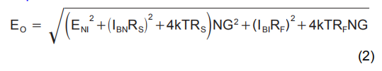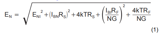 将该表达式除以噪声增益(NG=1+R偏移微调法,一个关键考虑因素是RF/RG)得出非转换输入处的等效输入参考点噪声电压,如等式2所示。