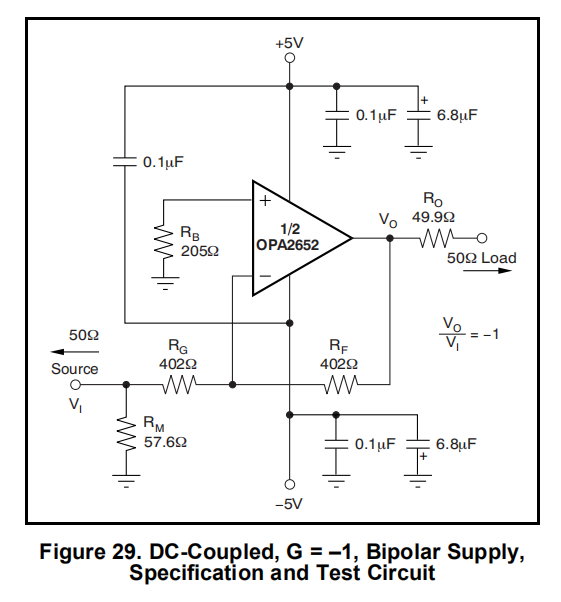 图29显示了增益为-1的直流耦合双极供电电路配置,该配置是G=-1时的规格和典型特性的基础。用于测试的输入阻抗匹配电阻器(57.6Ω)提供了50Ω的输入负载。电阻器(205Ω)将非换向输入接地。此配置提供直流源电阻匹配,以消除由输入偏置电流引起的输出误差。