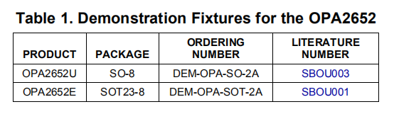 两块印刷电路板(PCB)可用于协助使用OPA2652的两个封装选项对电路性能进行初步评估。这两种产品都是免费提供的未填充多氯联苯,并附有用户指南。这些固定装置的汇总信息如表1所示。