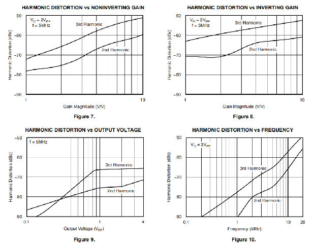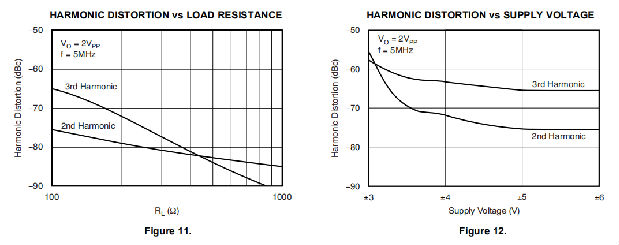 OPA2652在±5V电源的100Ω负载下提供了良好的失真性能。增加负载阻抗直接改善失真。请记住,总负载包括反馈网络;在非反转配置(图28)中,这是RF+RG的总和,而在反向配置中,只有RF。此外,在电源引脚之间提供额外的电源去耦电容器(0.1μF)(用于双极操作)可稍微改善二阶失真(3dB至6dB)。