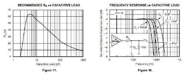 对运算放大器来说,最苛刻也是最常见的负载条件之一是电容性装载。经常电容性负载是模拟-数字(A/D)转换器的输入端,该转换器包括额外的外部电容,可用于改善A/D线性度。当放置电容性负载时,OPA2652这样的高速放大器很容易受到稳定性下降和闭环响应峰值的影响直接在输出引脚上。当考虑放大器的开环输出电阻时,这种电容性负载会在信号通路中增加一个极点,从而降低相位裕度。有人提出了解决这个问题的几种外部解决办法。当主要考虑的是频率响应平坦度、脉冲响应保真度和/或失真度时,最简单和最有效的解决方案是通过在放大器输出和电容性负载之间插入一个串联的隔离电阻,将电容性负载与反馈环隔离开。这个电阻并没有消除回路响应中的极点,而是将其移位,并在更高的频率上加一个零。附加零位的作用是消除电容性负载极的相位滞后,从而增加相位裕度,提高稳定性。
