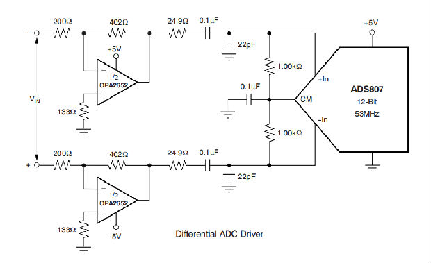 首页的电路显示了一个OPA2652以+2V/V的增益差分驱动ADS807模数转换器(ADC)。输出通过交流耦合到转换器,以适应电源电压的差异。非转换输入端的133Ω电阻器使直流偏移最小错误差分拓扑使偶数阶失真产品最小化,如二次谐波失真。