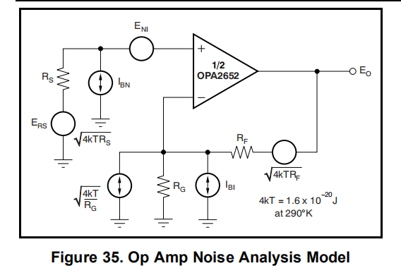 OPA2652输入参考电压噪声(8nV/√Hz)和两个输入参考电流噪声项(1.4pA/√Hz)结合在一起,可在各种操作条件下提供低输出噪声条件。图35显示了包含所有噪声项的运算放大器噪声分析模型。在这个模型中,所有的噪声项都被认为是噪声电压或电流密度项,单位为nV/√Hz或pA/√Hz。