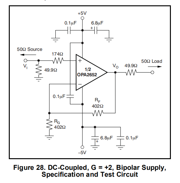 图28显示了作为±5V规格和典型值基础的直流耦合+2增益双电源电路配置特征。这个配置针对一个通道。另一个通道连接类似。出于测试目的,使用接地电阻将输入阻抗设置为50Ω,使用串联输出电阻将输出阻抗设置为50Ω。