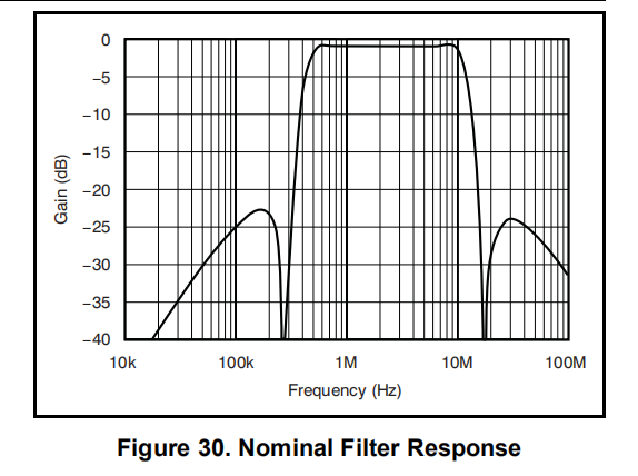图31显示了一个实现六阶带通滤波器的OPA2652。该滤波器级联两个带传输零点的二阶Sallen键段和一个双实极点段。它有0.3dB的纹波,450kHz和11MHz的-3dB频率,315kHz和16MHz的-23dB频率。20.0Ω电阻器将第一个OPA2652输出与电容性负载隔离。这种配置提高了稳定性,对滤波器响应的影响最小。图30显示了SPICE模拟的标称响应。