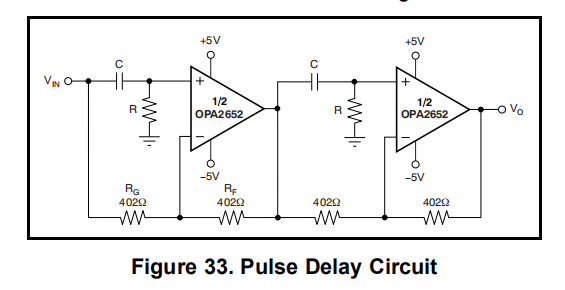 图33显示了用于脉冲延迟电路的OPA2652。该电路将OPA2652中的两个运算放大器级联,每个运算放大器形成一个单极有源全通滤波器。总增益为+1,通过滤波器的总延迟为:
