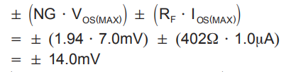 宽带电压反馈运算放大器的平衡输入级允许在各种应用中获得良好的直流输出精度。尽管高速输入级确实需要相对较高的输入偏置电流(通常每个输入端子4μA),但是它们之间的紧密匹配可用于显著减少由该电流引起的输出DC误差。这种降低是通过匹配出现在两个输入端的直流源电阻来实现的。这种匹配减少了由于输入偏置电流乘以反馈电阻而产生的输出直流误差。使用最坏情况+25°C输入偏移电压和电流规格评估图28的配置,得出最坏情况下的输出偏移电压等于: