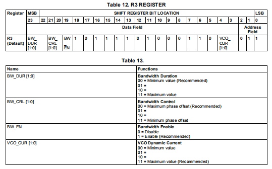 寄存器R3包含用于相位锁定带宽控制(BW_DUR、BW_CRL和BW_EN)的控件。这个带宽控制的数字控制器部分的持续时间由BW_DUR[1:0]设置。设定的最小时间使用00,并将持续时间增加到设置为11的最大值。BW_CRL[1:0]设置相位偏移标准对于带宽控制器。一旦基准时钟和分割的VCO信号之间的相位偏移在设定的标准内,带宽控制停止。最大相位偏移设置为00并减小到最小值设置为11。BW_EN在锁定状态下启用带宽控制。VCO动态电流也在寄存器R3中通过VCO_CUR[1:0]进行控制。最小值对应到00,并增加到11的最大值。