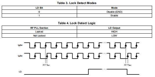 LD输出可用于指示射频锁相环的锁定状态。寄存器R0中的位21决定信号显示在LD引脚上。当射频锁相环未锁定时,LD引脚保持低电平。获得相位后锁定,LD引脚将具有逻辑高电平。输出也可编程为始终接地。
