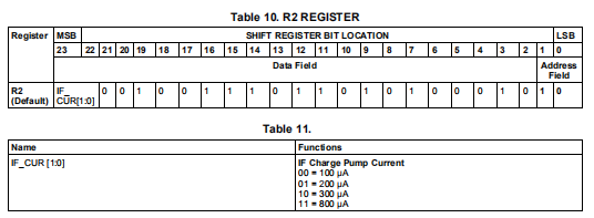 IF_ucur[1:0]位编程IF充油泵电流。考虑到外部IF VCO和环路滤波器,则用户可以选择充油泵电流为100μA、200μA、300μA或800μA的量。