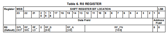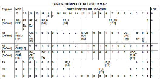串行接口有一个24位移位寄存器来临时存储输入的数据位。传入的数据是从MSB加载到LSB的移位寄存器中。数据在时钟信号的上升沿移位。锁存器启用信号从低到高转换,存储在移位寄存器中的数据被传输到正确的寄存器取决于地址位的设置。特定寄存器的选择由地址位等于控制寄存器编号的二进制表示。在初始启动时,MICROWIRE加载需要4个默认字(寄存器R3,先加载,再到R0,加载最后)。在对设备进行初始编程后,可以使用单个寄存器(R0)。如果需要设备默认值以外的中频频率,则SPI_DEF位应为如果u的值设为0,如果u的值为0,则将u设为0。
