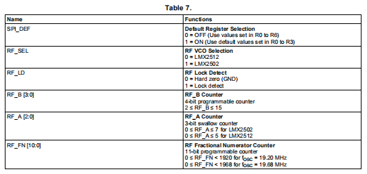 RF_A:预置二进制3位吞咽计数器的分频比(对于LMX2502,0≤RF_A≤7,对于LMX2502,0≤RF_A≤5LMX2512)