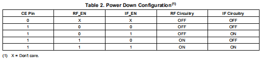 LMX2502和LMX2512包括断电模式以降低功耗。LMX2502/12通过使CE引脚处于低电平或通过在寄存器中设置断电位,进入断电模式R1。表2总结了断电功能。如果CE设置为低,则不管寄存器值。当CE高时,通过设置寄存器位。