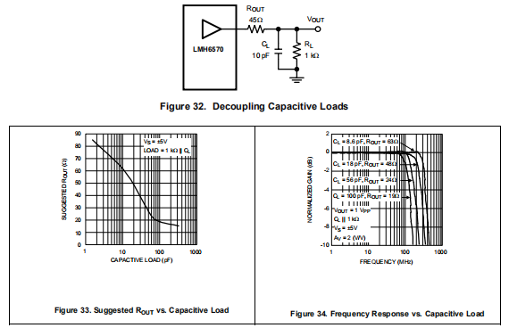 电容输出负载应用将受益于串联输出电阻路径的使用。图32显示使用一个串联的输出电阻ROUT来稳定电容负载下的放大器输出。电容的5到120 pF的负载是最关键的,会导致振铃、频率响应峰值和可能的振荡。图33给出了选择串联输出电阻器以减轻电容性负载的建议值。这个图表中建议的值选择频率响应峰值为0.5 dB或更低。这就产生了稳定时间和带宽之间的良好折衷。适用于最大频率响应为在需要的情况下,一些峰值是可以容忍的,ROUT的值可以在建议值的基础上稍微降低。