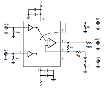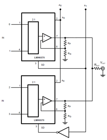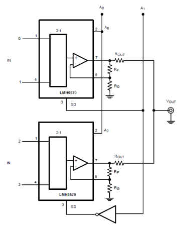 可以使用多个LMH6570设备来扩展可选择用于输出的输入的数量。