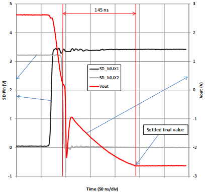 图29显示了典型的转换波形,并显示了SD管脚开关在小于145纳秒的时间内稳定下来。
