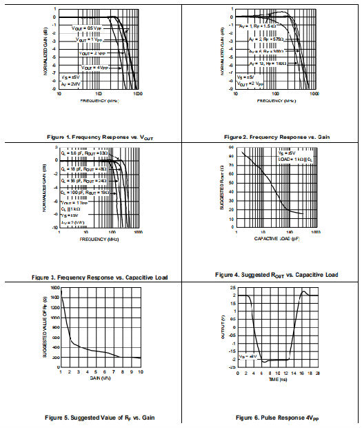 LMH6570具有电流反馈输出缓冲器,其增益由外部反馈(RF)和增益设置确定电阻器(RG)。对于电流反馈放大器,闭环频率响应是射频的函数。为了增益为2 V/V,建议RF值为576Ω。对于其他收益,请参见图26。通常,降低射频从建议值将峰值频率响应和扩展带宽,同时增加RF值会使频率响应更快地衰减。将RF的值降低到建议值将导致过冲、响铃和最终振荡。由于所有的应用都略有不同,因此有必要进行一些实验,以找到给定条件下的最佳射频电路。有关更多信息,请参阅电流反馈回路增益分析和性能增强,应用说明OA-13(SNOA366),描述了射频和闭环频率之间的关系电流反馈运算放大器的响应。针脚8的阻抗约为20Ω。这使得增益高达10V/V时具有良好的带宽。当与超过10V/V的增益一起使用时,LMH6570将展示一个“增益带宽产品”类似于典型的电压反馈放大器。增益超过10 V/V考虑选择像LMH6720这样的高性能视频放大器来提供额外的增益。