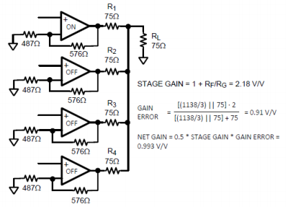 关闭管脚使输出级进入高阻抗状态,几个LMH6570器件可以连接在一起形成一个更大的输入MUX。但是,由于未选择的设备。图31中的电路显示了如何补偿这种影响。对于8:1 MUX函数如图31所示,增益误差约为0.7%或−0.06dB。在图31中的电路中,电阻比已调整以补偿此增益误差。通过调整每个多路复用电路的增益可以减小到所用电阻器的公差(本例中为1%)。