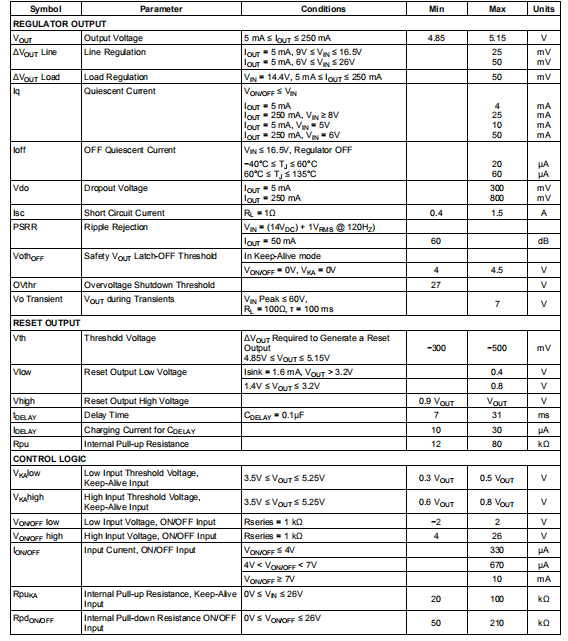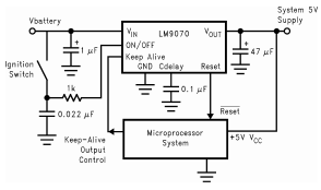 宽工作温度范围−40°C,以发出信号,同时产生第二个保持活动输入+125°C,由系统控制器控制。这使得系统能够关闭点火开关后,TO-263和20针电动表面贴装保持打开状态。这个然后系统断电控制器可以执行程序包然后命令调节器关闭