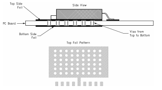 TO-263封装(静止空气,无额外散热片)的θJ-A值额定为80°C/W。有效θJ-ATO-263封装的值可以通过增加所连接的印刷电路板面积而降低(焊接)到包选项卡。使用1盎司(1.4密耳厚)覆铜,无焊锡掩模,面积0.5平方英寸将把θJ-A降低到50°C/W,1.0平方英寸的面积将使θJ-Ato降低37°C/W,并且1.6平方英寸可将θJ-A降低至32°C/W。如果印刷电路板使用焊接掩模,则镀铜面积在焊接掩模下应至少增加50%,以保持类似的θJ-a额定值。在两个铜平面之间使用带有焊接填充过孔的双面PC板,如中所示图24将提高热性能,同时优化所需的PC板表面积。使用双面PC板布置如图24所示,带有1盎司(1.4密耳厚)的铜包层,无焊料掩模和焊料填充过孔,两侧0.5平方英寸的面积将使θJ-A降低到43°C/W。
