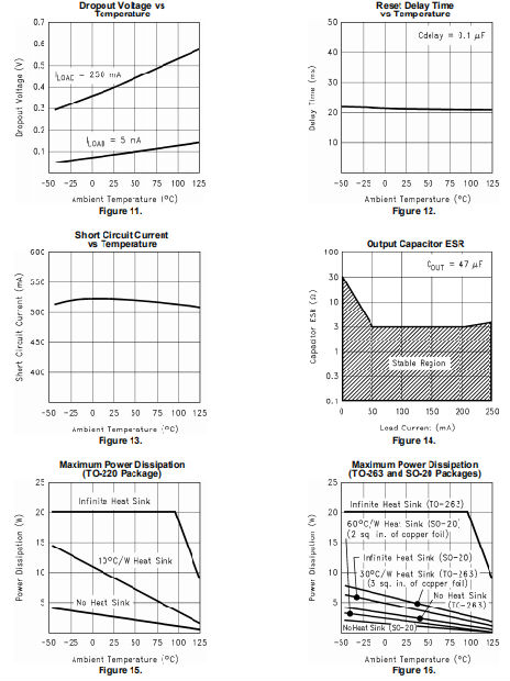 (3) 超过最大允许功耗将导致模具温度过高,设备将进入热状态关机。TO-263封装(静止空气,无额外散热片)的θJ-A值为80°C/W。TO-263的有效θJ-A值通过增加连接(焊接)到封装标签的印刷电路板面积,可以减少封装。使用1盎司(1.4密耳厚)覆铜,无焊接掩模,0.5平方英寸的面积将使θJ-A降低到50°C/W,1.0平方英寸的面积将降低θJ-Ato 37°C/W,1.6平方英寸的面积将把θJ-A降低到32°C/W。如果印刷电路板使用焊接掩模,则覆铜面积应至少增加50%,以保持类似的θJ-a额定值。