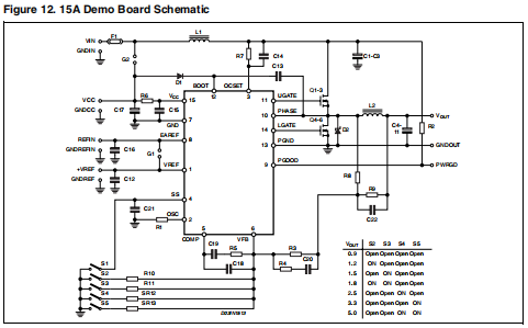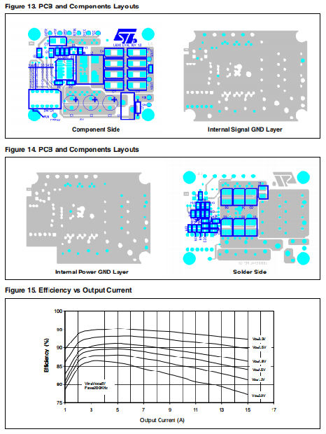 演示板显示了设备在一个通用应用程序中的操作。根据报告的表,该评估板通过开关S2-S5将电压可调性从0.9V降低到5V,当使用内部0.9V参考电压(G1关闭)。超过20A的输出电流可以通过使用的mosfet类型:高侧和低压侧开关可使用多达三个SO8 mosfet。外部参考可用于仅打开G1和开关S2-S5的调节。设备也可以使用开关S1禁用。VCC输入轨为设备供电,而电源转换从VIN输入轨。该设备还能够在单一电源电压下工作;在这种情况下,跨接器G2具有关闭,5V至12V输入可以直接连接到VIN输入。四层演示板考虑到电路的高电流,铜厚度为70μm,以尽量减少传导损耗能够交给我PGOOD信号被用作逻辑电平,由于没有演示板上有其他合适的电压。如果输入电压高于7V(PGOOD引脚最大绝对额定值)需要5V参考电压。图12显示了演示板的电路原理图