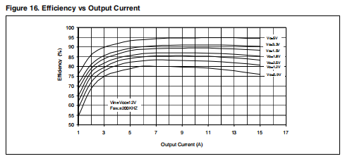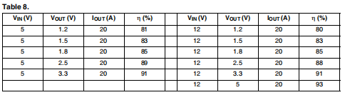 对于高达20A的更高输出电流,可使用以下配置(参考演示板示意图):Q1、Q2、Q3:STS11NF30L问题4、问题5、问题6:STS17NF3LL五十: 2.5μH磁性77121A7芯7T 2x AWG16在这些条件下,实现了以下性能: