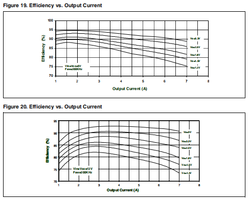 图19、20显示了不同输出电压值下测量的效率与负载电流的关系。测量已在5V和12V输入下完成。输出电压已更改,修改中的R1值零件清单中报告的演示板。