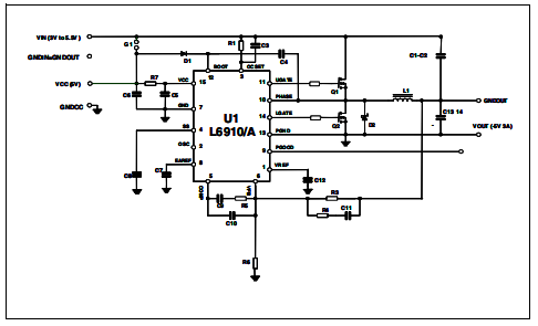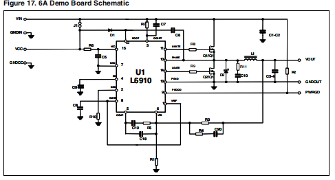 一个紧凑的演示板已经实现,以管理5A-6A范围内的电流。外部功率mosfet包含在单个SO8封装中,以节省空间和增加功率密度。为VCC和VIN提供两个单独的导轨。它们可以通过短接跨接导线J1连接在一起。PGOOD信号被用作逻辑电平,它被拉到了VIN,因为没有其他合适的信号演示板上提供电压。如果输入电压高于7V(PGOOD引脚最大Ab 溶质额定值),则需要5V参考电压。