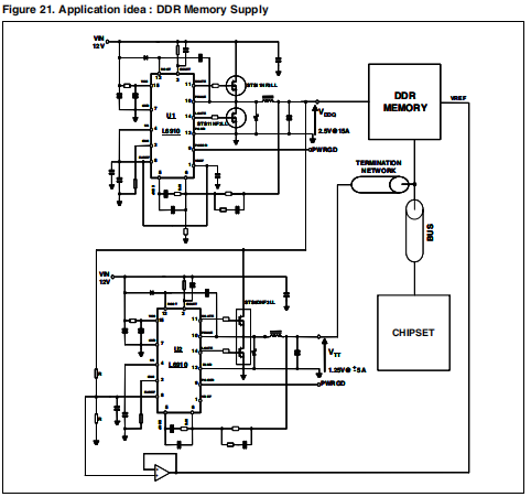 应用思路一:DDR存储器和终端电源双数据速率(DDR)存储器需要特定的电源管理架构。这是因为驱动芯片组和存储器输入之间的跟踪必须用电阻器终止。因为驱动存储器的芯片组有一个推挽输出缓冲器,所以终端电压必须能够源电流和下沉电流。此外,终端电压必须等于存储器电源的一半(存储器的输入为一种需要一个参考偏差中点的差分阶段。DDRI是内存的供给2.5V,端接电压1.25V,DDRII内存供电1.8V,端接电压为0.9V。图23显示了一个完整的DDRI存储器和终端电源,使用2 L6910G-ic/" title="xL6910G">xL6910G。2.5V部分为内存供电,而1.25V部分提供终端电压。两段之间的跟踪是通过提供1.25V段的EAREF电压来实现的连接到2.5V的电阻分压器。