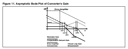 补偿网络由内部误差放大器和阻抗网络ZIN(R3,R4和C20)和ZFB(R5、C18和C19)。补偿网络必须提供闭环传递函数具有快速响应(但始终低于fsw/10)和最高增益的最高0dB交叉频率在直流条件下尽量减小负载调节。一个稳定的控制回路具有-20dB/decade斜率的增益交叉,相位裕度大于45°。包括确定相位裕度时的最坏情况分量变化。为了定位补偿网络的极点和零点,可以使用以下建议:调制器奇异频率: