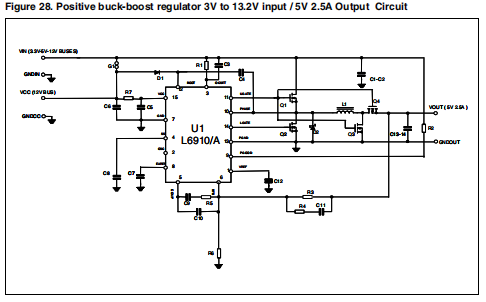 应用思路二:正压升压调节器3V~13.2V输入/5V 2.5A输出在某些应用中,输入电压变化范围很广,而输出电压必须调节到固定值。在这种情况下,为了保持输出电压的调节,可能需要一个Buck-Boost拓扑。下面的示意图显示了如何在3.3V和5V的输出端实现降压升压调节5V和12V输入总线。在Buck-Boost拓扑中,电流仅在关相时被传输到输出端。所以,对于给定的电流极限,最大输出电流很大程度上取决于占空比。假设效率为100%,忽略了电感上的电流纹波,电流限制与最大输出之间的关系电流如下: