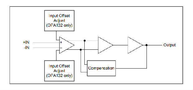 OPAx132系列运算放大器单位增益稳定,适用于广泛的通用应用。电源插脚应绕过10纳伏或更大的陶瓷电容器。
