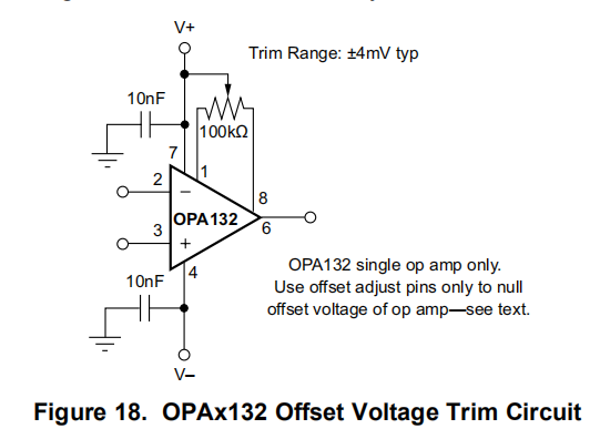 OPAx132系列放大器的偏置电压是激光微调的,通常不需要用户调整。OPAx132放大器(单运算放大器版本)在针脚1和8上提供偏移电压微调连接。如图18所示,可以通过连接电位计来调整偏移电压。此调整仅用于使运算放大器的偏移归零,而不是调整系统偏移或信号源产生的偏移。零位偏移会降低运算放大器的偏移电压漂移特性。虽然无法预测漂移的确切变化,但影响通常很小。