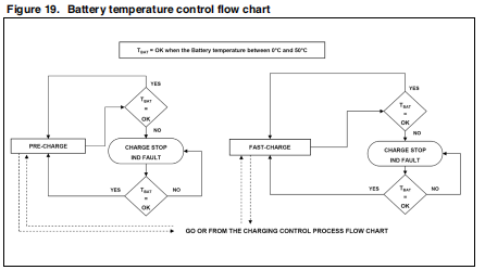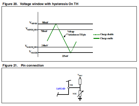该装置允许设计者通过测量电压来监控电池温度通过NTC或PTC电阻器。锂离子电池的工作温度范围很窄,通常在0°C到50°C之间。此窗口可通过外部分频器进行编程由一个连接到GND的NTC热敏电阻和一个连接到VREF的电阻器组成。TH引脚上的电压超过最小或最大电压阈值(内部窗口比较器),设备停止充电过程,并指示故障状态通过状态引脚。当电压(和温度)回到窗口范围时,设备重新启动充电过程。此外,上下阈值都存在滞后现象,如图20所示