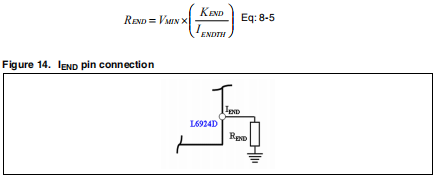 当充电电压接近选定值(4.1V或4.2V)时,电压调节阶段发生了。充电电流开始下降,直到低于a可编程端值,IENDTH,取决于连接在IEND引脚和GND图14。描述这种关系的公式如下: